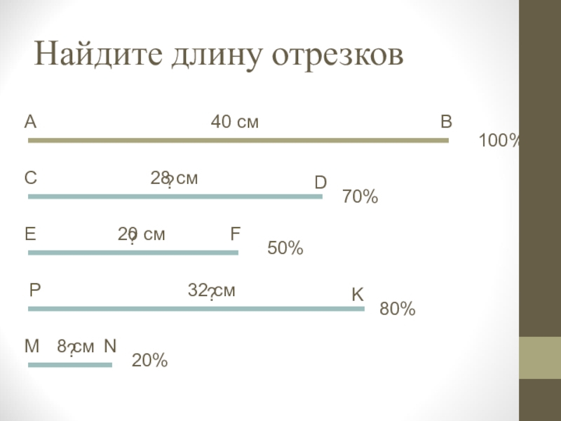 Найдите длину отрезковАВ40 см100%СD70%?28 cмEF50%?20 cмPK80%?32 cмMN20%?8 cм