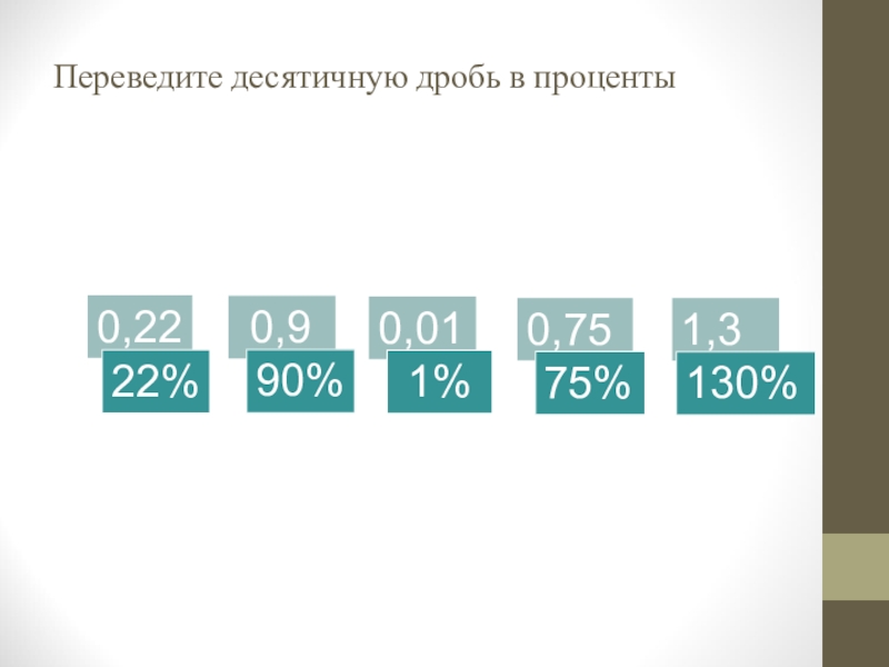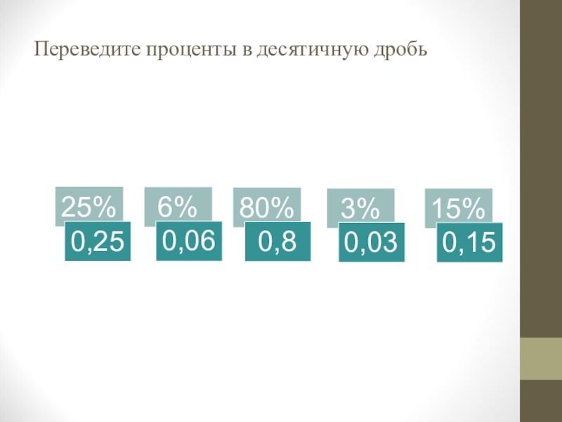 Переведите проценты в десятичную дробь25%0,25 6%0,0680% 0,8 3%0,0315%0,15