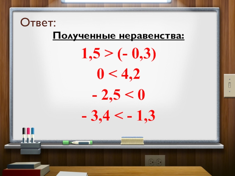 Ответ: Полученные неравенства:1,5 > (- 0,3)0 < 4,2- 2,5 < 0- 3,4 < - 1,3