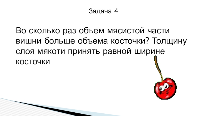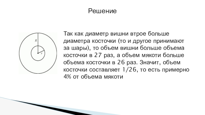 принимают за шары), то объем вишни больше объема косточки в 27 раз, а объем мякоти больше объема косточки в 26 раз. Значит, объем косточки составляет 1/26, то есть примерно 4% от объема мякоти