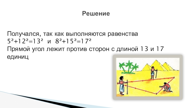 земле треугольник с соотношением сторон 5:12:13 или 8:15:17. Получался ли при этом прямой угол и если да, то против какой стороны?
