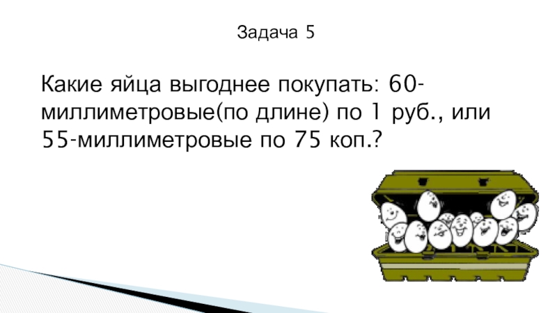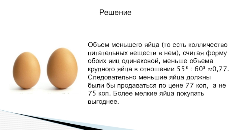 форму обоих яиц одинаковой, меньше объема крупного яйца в отношении 55³ : 60³ ≈0,77. Следовательно меньшие яйца должны были бы продаваться по цене 77 коп, а не 75 коп. Более мелкие яйца покупать выгоднее.