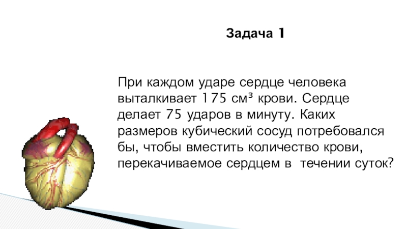 делает 75 ударов в минуту. Каких размеров кубический сосуд потребовался бы, чтобы вместить количество крови, перекачиваемое сердцем в течении суток?