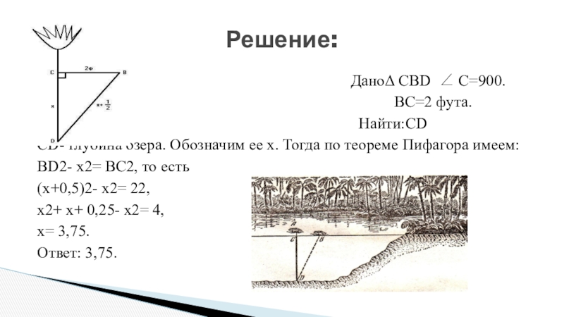 CD- глубина озера. Обозначим ее х. Тогда по теореме Пифагора имеем: