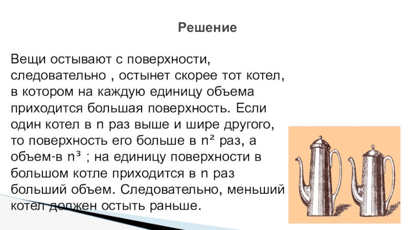 котором на каждую единицу объема приходится большая поверхность. Если один котел в n раз выше и шире другого, то поверхность его больше в n² раз, а объем-в n³ ; на единицу поверхности в большом котле приходится в n раз больший объем. Следовательно, меньший котел должен остыть раньше.