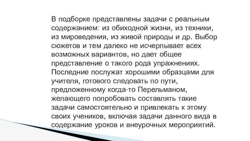 техники, из мироведения, из живой природы и др. Выбор сюжетов и тем далеко не исчерпывает всех возможных вариантов, но дает общее представление о такого рода упражнениях. Последние послужат хорошими образцами для учителя, готового следовать по пути, предложенному когда-то Перельманом, желающего попробовать составлять такие задачи самостоятельно и привлекать к этому своих учеников, включая задачи данного вида в содержание уроков и внеурочных мероприятий.