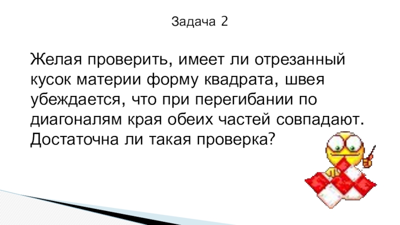 Желая проверить, имеет ли отрезанный кусок материи форму квадрата, швея