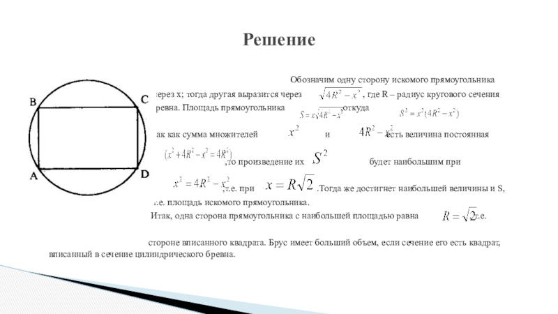 стороне вписанного квадрата. Брус имеет больший объем, если сечение его есть квадрат, вписанный в сечение цилиндрического бревна.