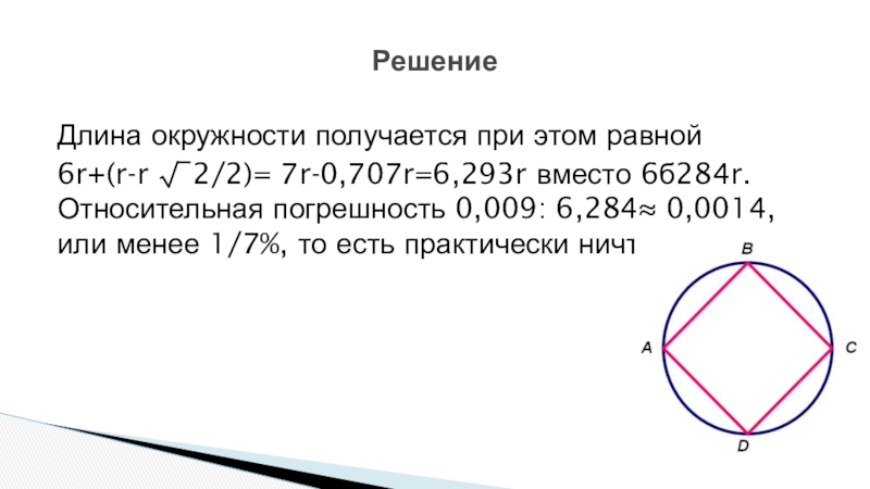 окружности: откладывают на прямой 6 раз радиус данной окружности и прибавляют высоту меньшего сегмента, отрезаемого стороной вписанного в эту окружность квадрата. Оцените точность результата, который дает этот прием