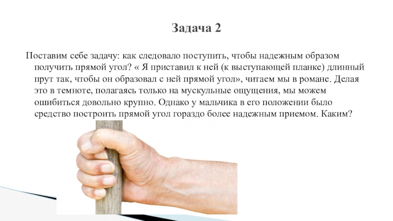прямой угол? « Я приставил к ней (к выступающей планке) длинный прут так, чтобы он образовал с ней прямой угол», читаем мы в романе. Делая это в темноте, полагаясь только на мускульные ощущения, мы можем ошибиться довольно крупно. Однако у мальчика в его положении было средство построить прямой угол гораздо более надежным приемом. Каким?