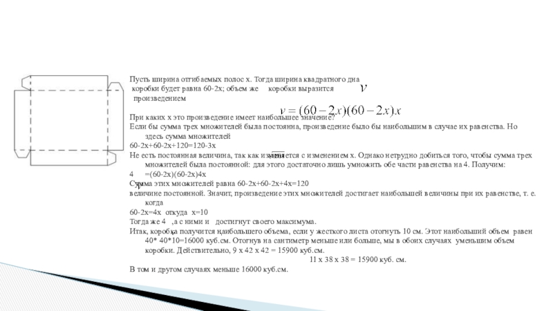 Итак, коробка получится наибольшего объема, если у жесткого листа отогнуть 10 см. Этот наибольший объем равен 40* 40*10=16000 куб.см. Отогнув на сантиметр меньше или больше, мы в обоих случаях уменьшим объем коробки. Действительно, 9 х 42 х 42 = 15900 куб.см.