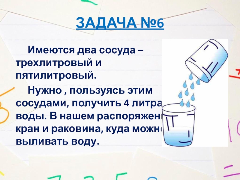 этим сосудами, получить 4 литра воды. В нашем распоряжении кран и раковина, куда можно выливать воду.