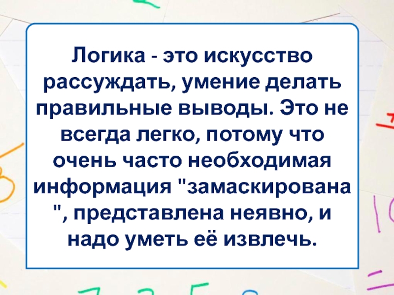 Слайд 2Логика - это искусство рассуждать, умение делать правильные выводы. Это не