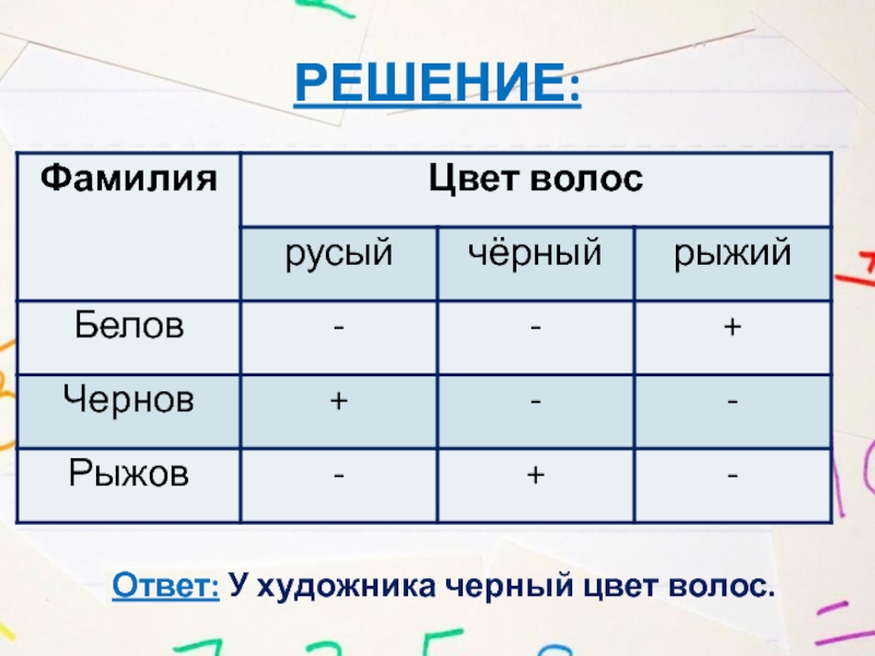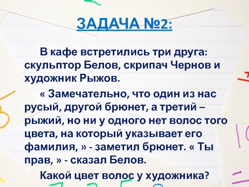 « Замечательно, что один из нас русый, другой брюнет, а третий – рыжий, но ни у одного нет волос того цвета, на который указывает его фамилия, » - заметил брюнет. « Ты прав, » - сказал Белов.