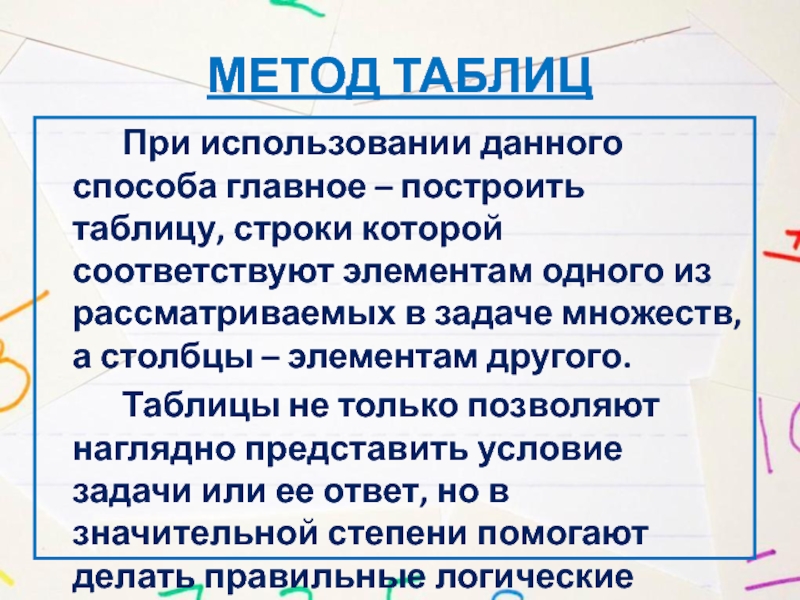 Таблицы не только позволяют наглядно представить условие задачи или ее ответ, но в значительной степени помогают делать правильные логические выводы в ходе решения задачи