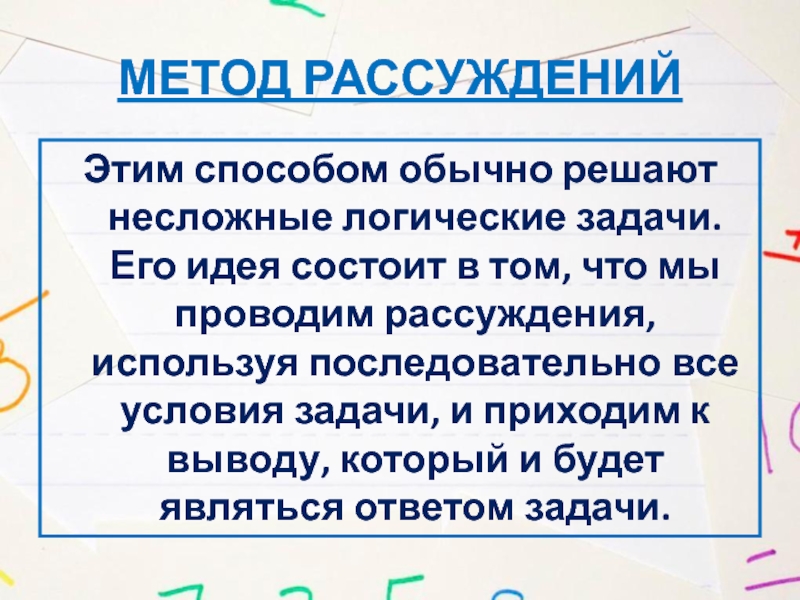 Этим способом обычно решают несложные логические задачи. Его идея состоит