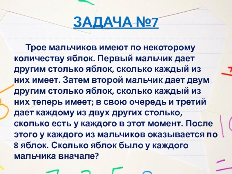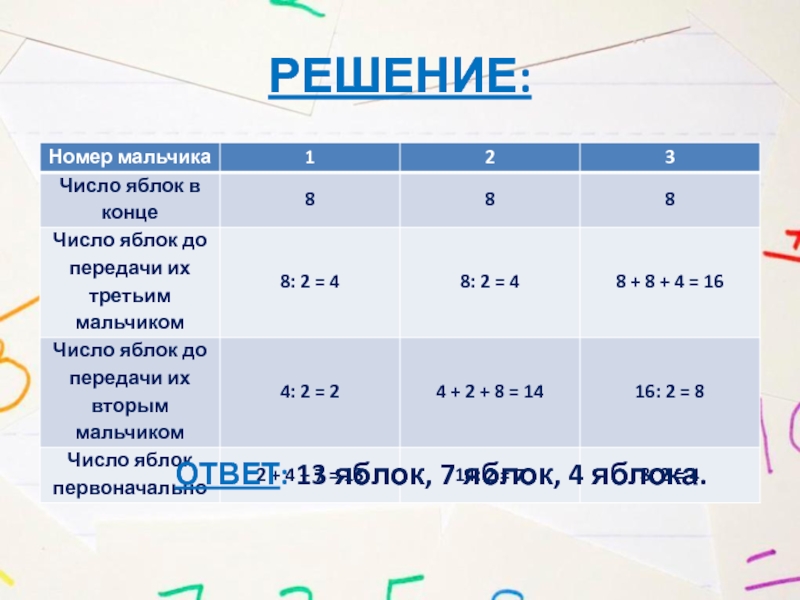 другим столько яблок, сколько каждый из них имеет. Затем второй мальчик дает двум другим столько яблок, сколько каждый из них теперь имеет; в свою очередь и третий дает каждому из двух других столько, сколько есть у каждого в этот момент. После этого у каждого из мальчиков оказывается по 8 яблок. Сколько яблок было у каждого мальчика вначале?