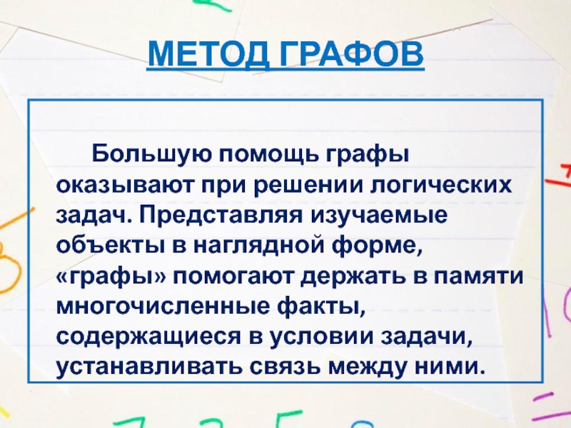 объекты в наглядной форме, «графы» помогают держать в памяти многочисленные факты, содержащиеся в условии задачи, устанавливать связь между ними.