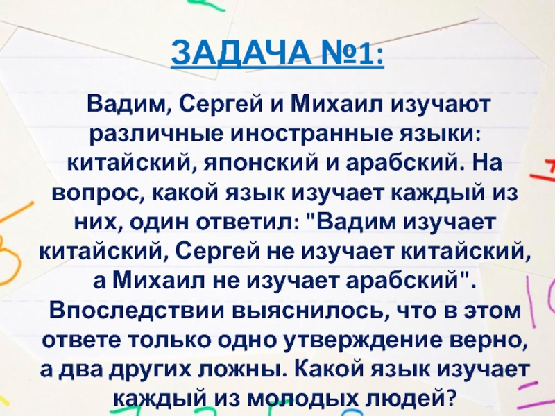 и арабский. На вопрос, какой язык изучает каждый из них, один ответил: "Вадим изучает китайский, Сергей не изучает китайский, а Михаил не изучает арабский". Впоследствии выяснилось, что в этом ответе только одно утверждение верно, а два других ложны. Какой язык изучает каждый из молодых людей?