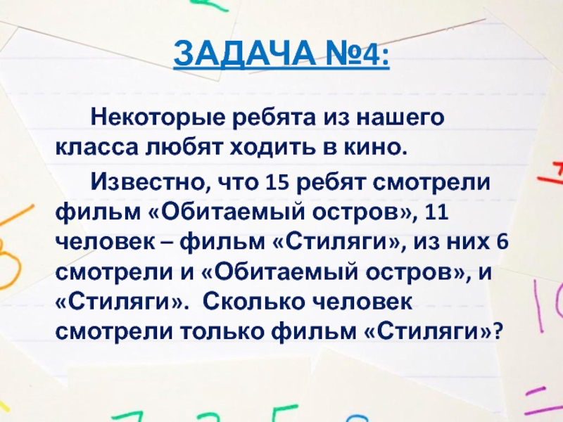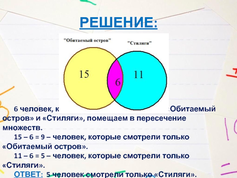 11 – 6 = 5 – человек, которые смотрели только «Стиляги».