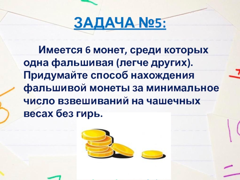 В таких задачах от решающего требуется локализовать отличающийся от остальных предмет по весу за ограниченное число взвешиваний.