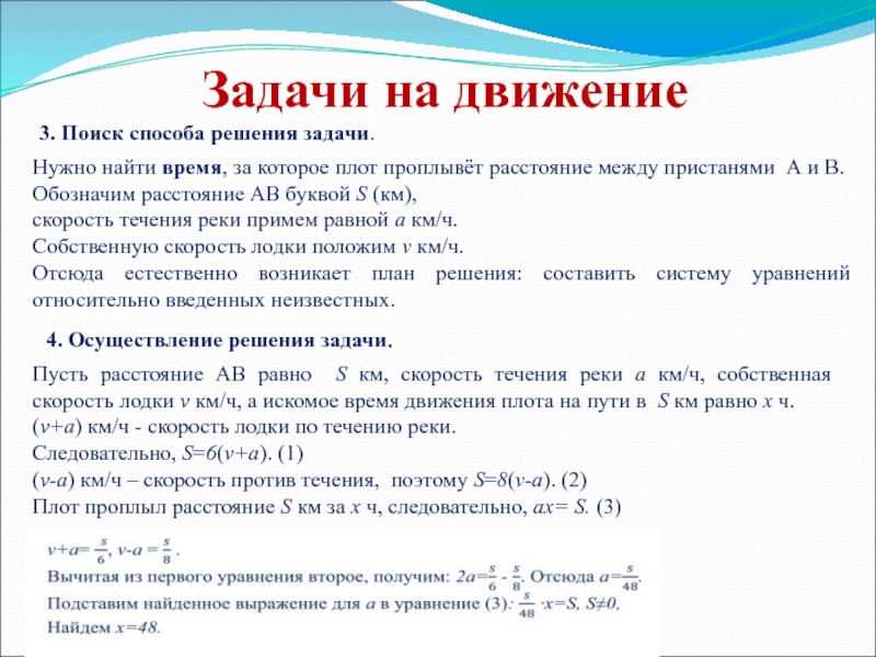 Пусть расстояние АВ равно S км, скорость течения реки а км/ч, собственная скорость лодки v км/ч, а искомое время движения плота на пути в S км равно х ч.