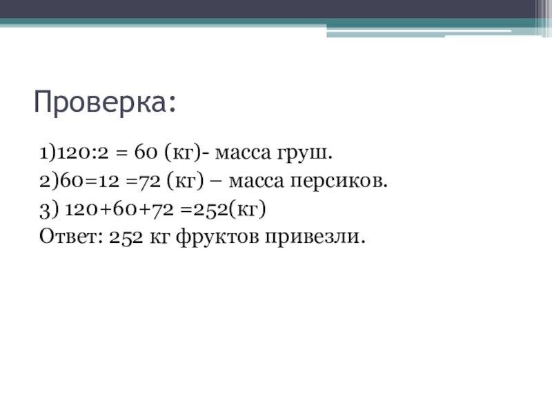 Проверка:1)120:2 = 60 (кг)- масса груш.2)60=12 =72 (кг) – масса персиков.3) 120+60+72 =252(кг)Ответ: 252 кг фруктов привезли.