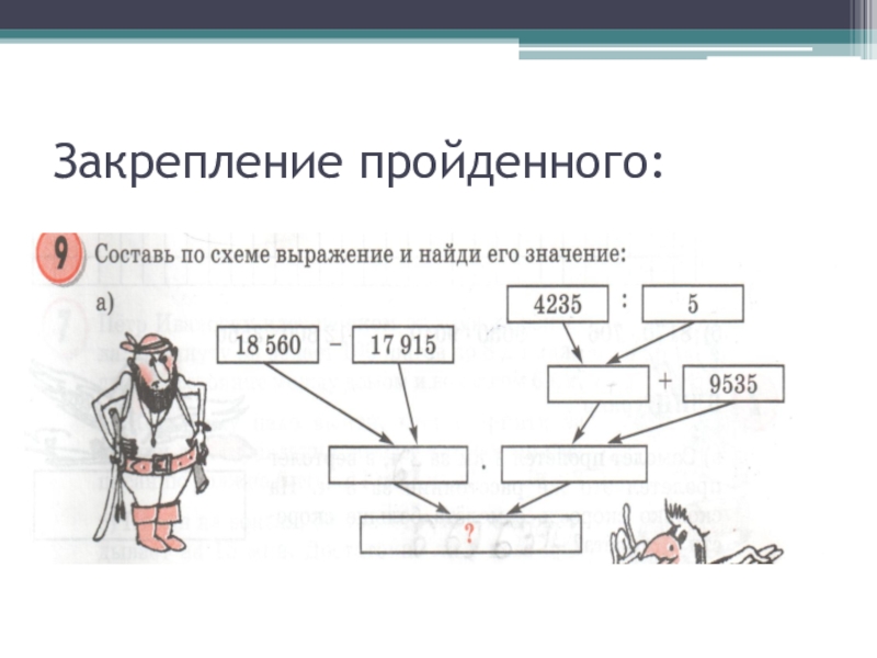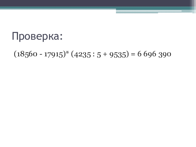 Проверка:(18560 - 17915)* (4235 : 5 + 9535) = 6 696 390