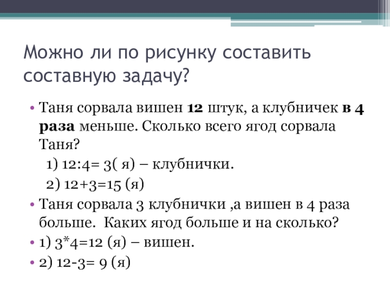 Можно ли по рисунку составить составную задачу?Таня сорвала вишен 12 штук, а клубничек в 4 раза меньше.