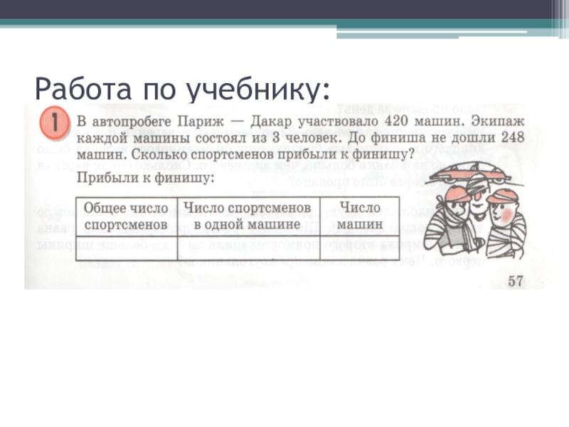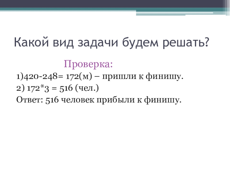 Какой вид задачи будем решать?Проверка:1)420-248= 172(м) – пришли к финишу.2) 172*3 = 516 (чел.)Ответ: 516 человек прибыли