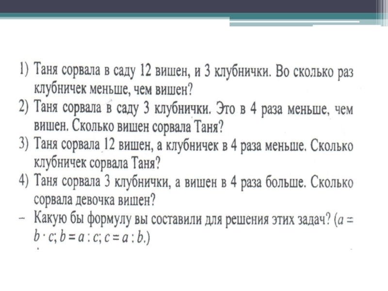 Таня сорвала 3 клубнички ,а вишен в 4 раза больше. Каких ягод больше и на сколько?