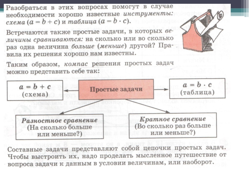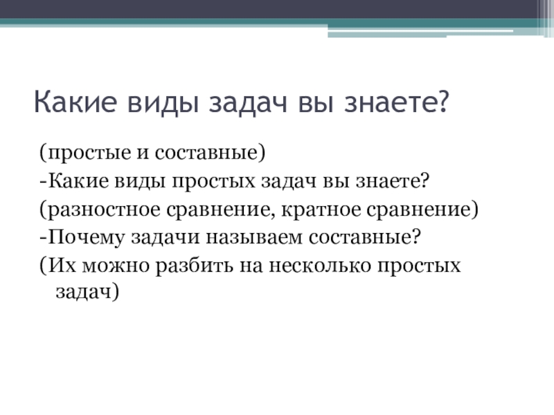 Какие виды задач вы знаете?(простые и составные)-Какие виды простых задач вы знаете?(разностное сравнение, кратное сравнение)-Почему задачи называем
