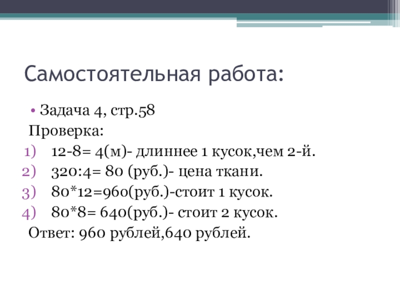Самостоятельная работа:Задача 4, стр.58Проверка:12-8= 4(м)- длиннее 1 кусок,чем 2-й.320:4= 80 (руб.)- цена ткани.80*12=96о(руб.)-стоит 1 кусок.80*8= 640(руб.)- стоит