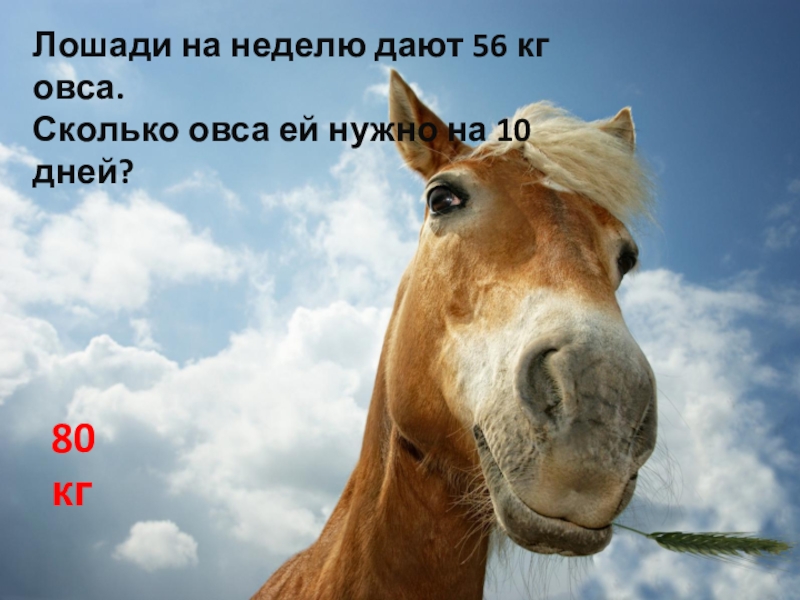 Слайд 7Лошади на неделю дают 56 кг овса.
