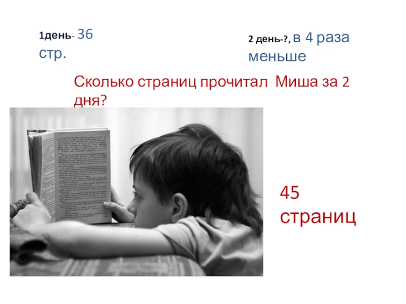 1день- 36 стр.2 день-?, в 4 раза меньшеСколько страниц прочитал Миша за 2 дня?45 страниц
