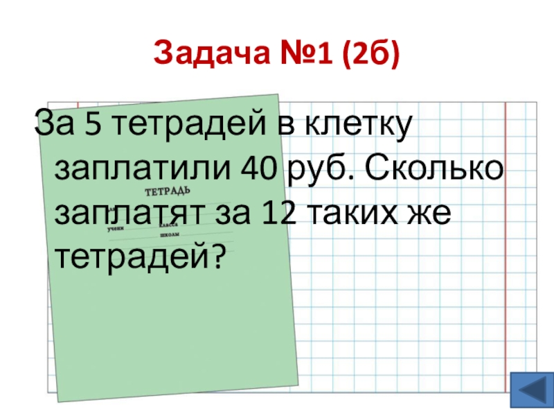Задача №1 (2б)За 5 тетрадей в клетку заплатили 40 руб. Сколько заплатят за 12 таких же тетрадей?