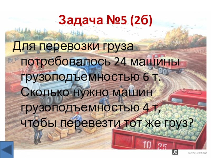 Задача №5 (2б)Для перевозки груза потребовалось 24 машины грузоподъемностью 6 т.Сколько нужно машин грузоподъемностью 4 т, чтобы