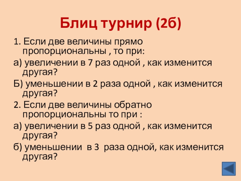 Блиц турнир (2б)1. Если две величины прямо пропорциональны , то при:а) увеличении в 7 раз одной ,