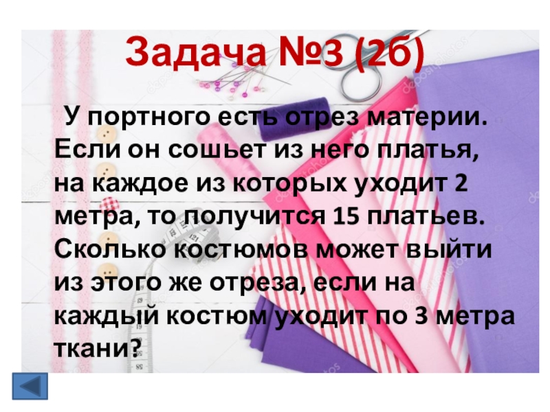 Задача №3 (2б)   У портного есть отрез материи. Если он сошьет из него платья, на