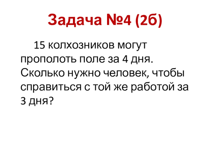 Задача №4 (2б)    15 колхозников могут прополоть поле за 4 дня. Сколько нужно человек,