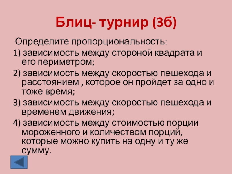 Блиц- турнир (3б) Определите пропорциональность:1) зависимость между стороной квадрата и его периметром;2) зависимость между скоростью пешехода и расстоянием , которое он пройдет за одно и тоже время;3) зависимость между скоростью пешехода и временем движения;4) зависимость между