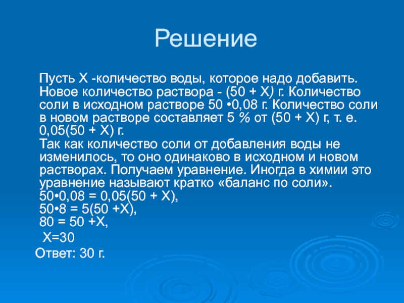 раствора - (50 + Х) г. Количество соли в исходном растворе 50 •0,08 г. Количество соли в новом растворе составляет 5 % от (50 + Х) г, т. е. 0,05(50 + Х) г.