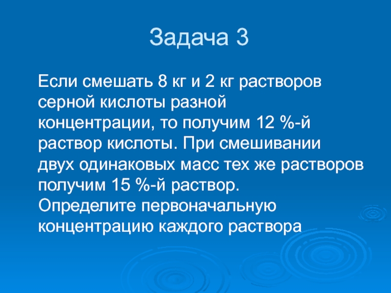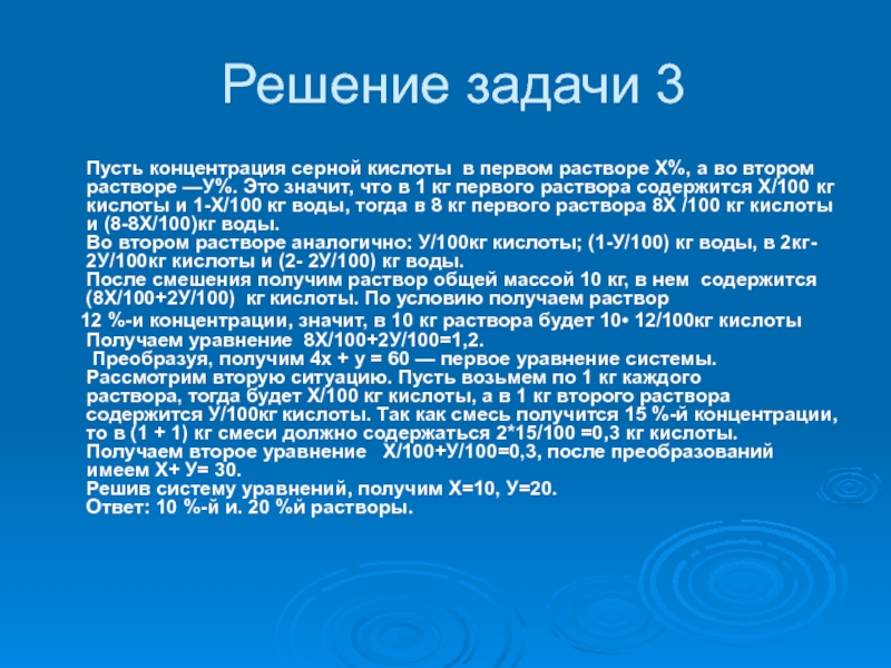 раствора, тогда будет Х/100 кг кислоты, а в 1 кг второго раствора содержится У/100кг кислоты. Так как смесь получится 15 %-й концентрации, то в (1 + 1) кг смеси должно содержаться 2*15/100 =0,3 кг кислоты.