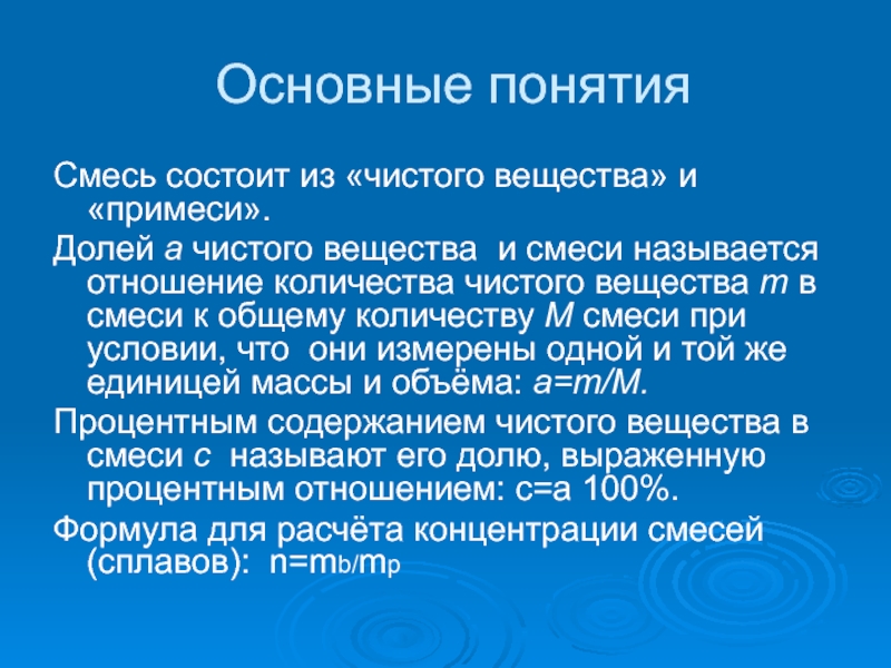 Процентным содержанием чистого вещества в смеси с называют его долю, выраженную процентным отношением: с=а 100%.