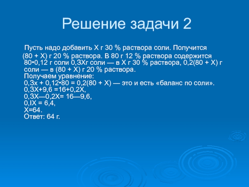 (80 + Х) г 20 % раствора. В 80 г 12 % раствора содержится 80•0,12 г соли 0,ЗХг соли — в Х г 30 % раствора, 0,2(80 + Х) г соли — в (80 + Х) г 20 % раствора.
