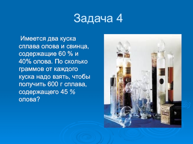 содержащие 60 % и 40% олова. По сколько граммов от каждого куска надо взять, чтобы получить 600 г сплава, содержащего 45 % олова?