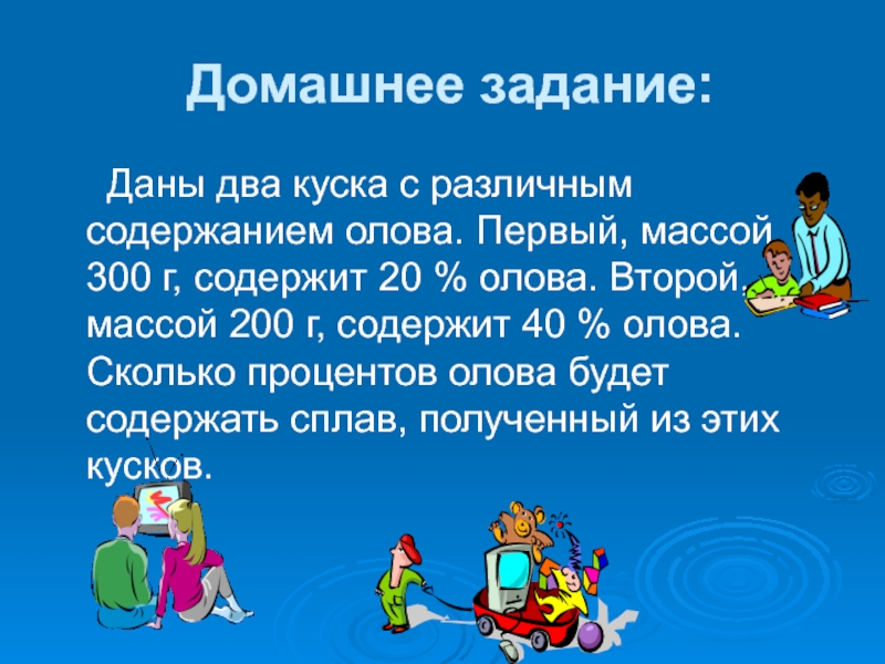 олова. Первый, массой 300 г, содержит 20 % олова. Второй, массой 200 г, содержит 40 % олова. Сколько процентов олова будет содержать сплав, полученный из этих кусков.