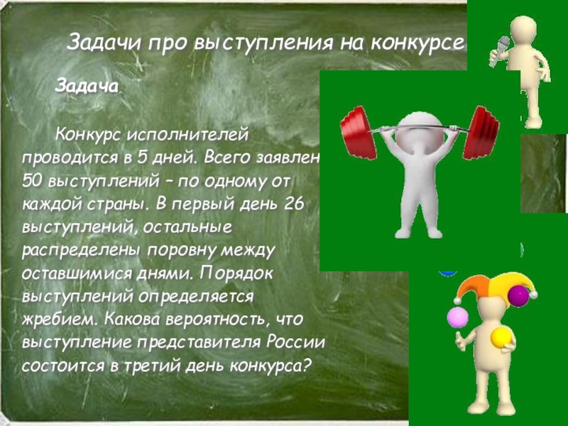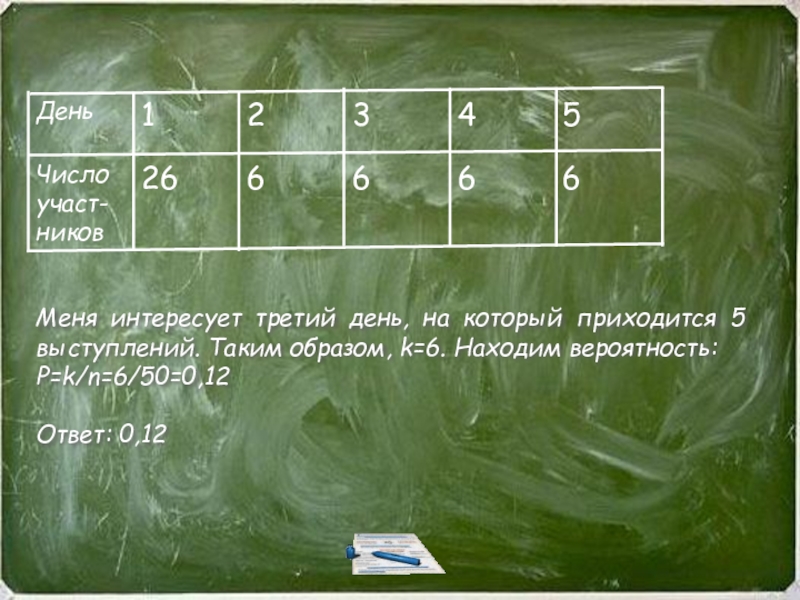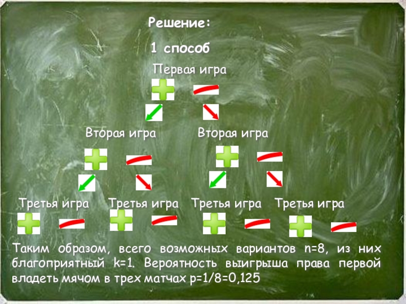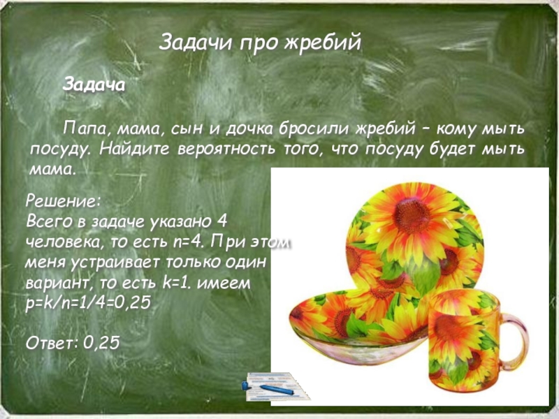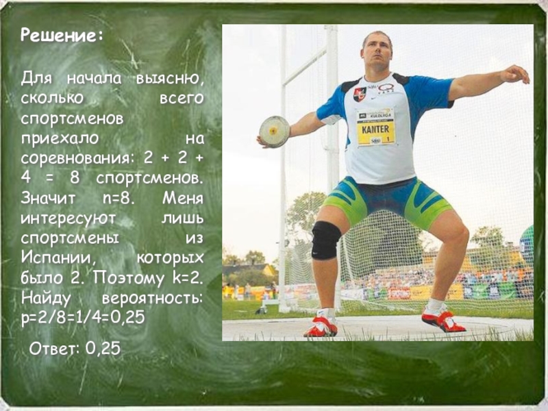 Всего в задаче указано 4 человека, то есть n=4. При этом меня устраивает только один вариант, то есть k=1. имеем p=k/n=1/4=0,25