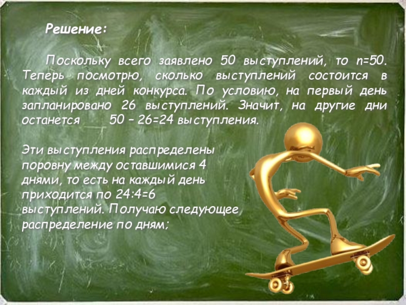 Эти выступления распределены поровну между оставшимися 4 днями, то есть на каждый день приходится по 24:4=6 выступлений. Получаю следующее распределение по дням;