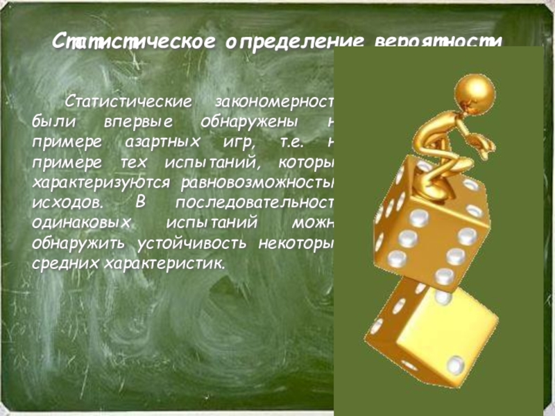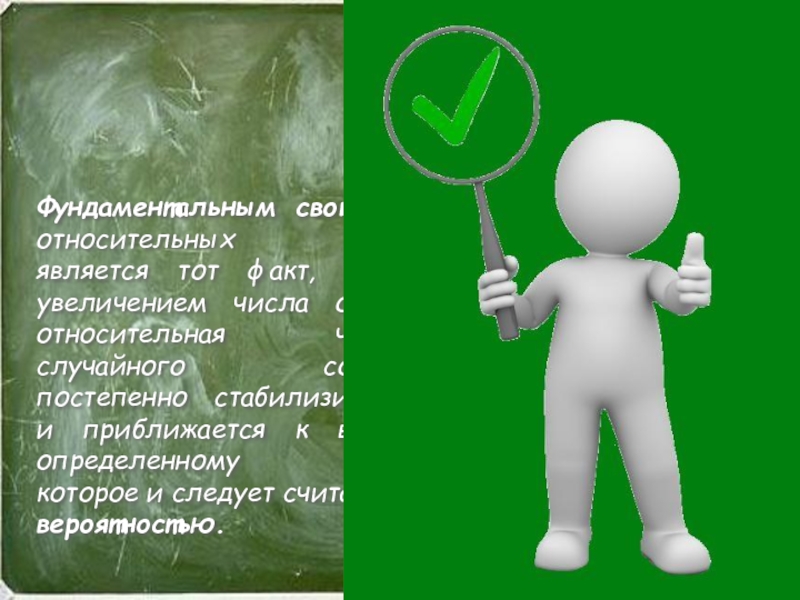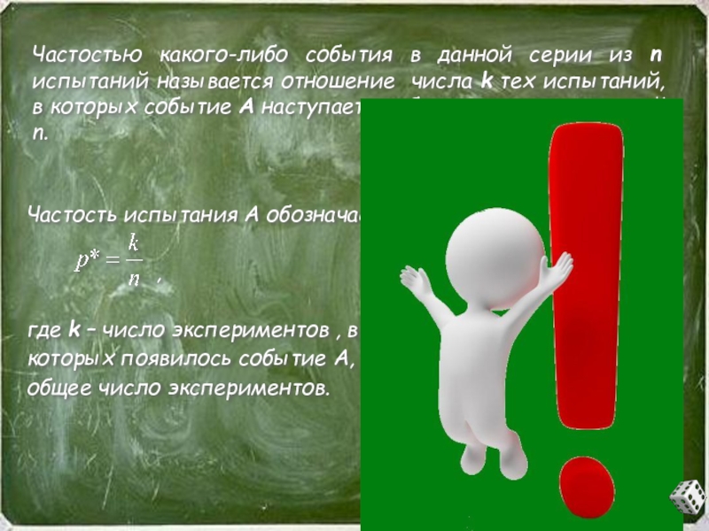 где k – число экспериментов , в которых появилось событие А, n – общее число экспериментов.